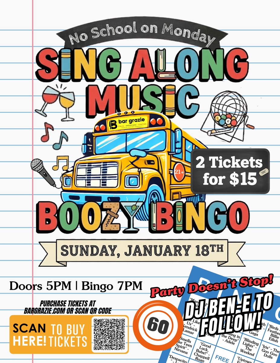 ๐ NO SCHOOL MONDAY = SUNDAY FUNDAY VIBES! Sing-Along Music Boozy Bingo at Bar Grazie ๐ Sunday, January 18 โฐ Doors 5PM | Bingo 7PM