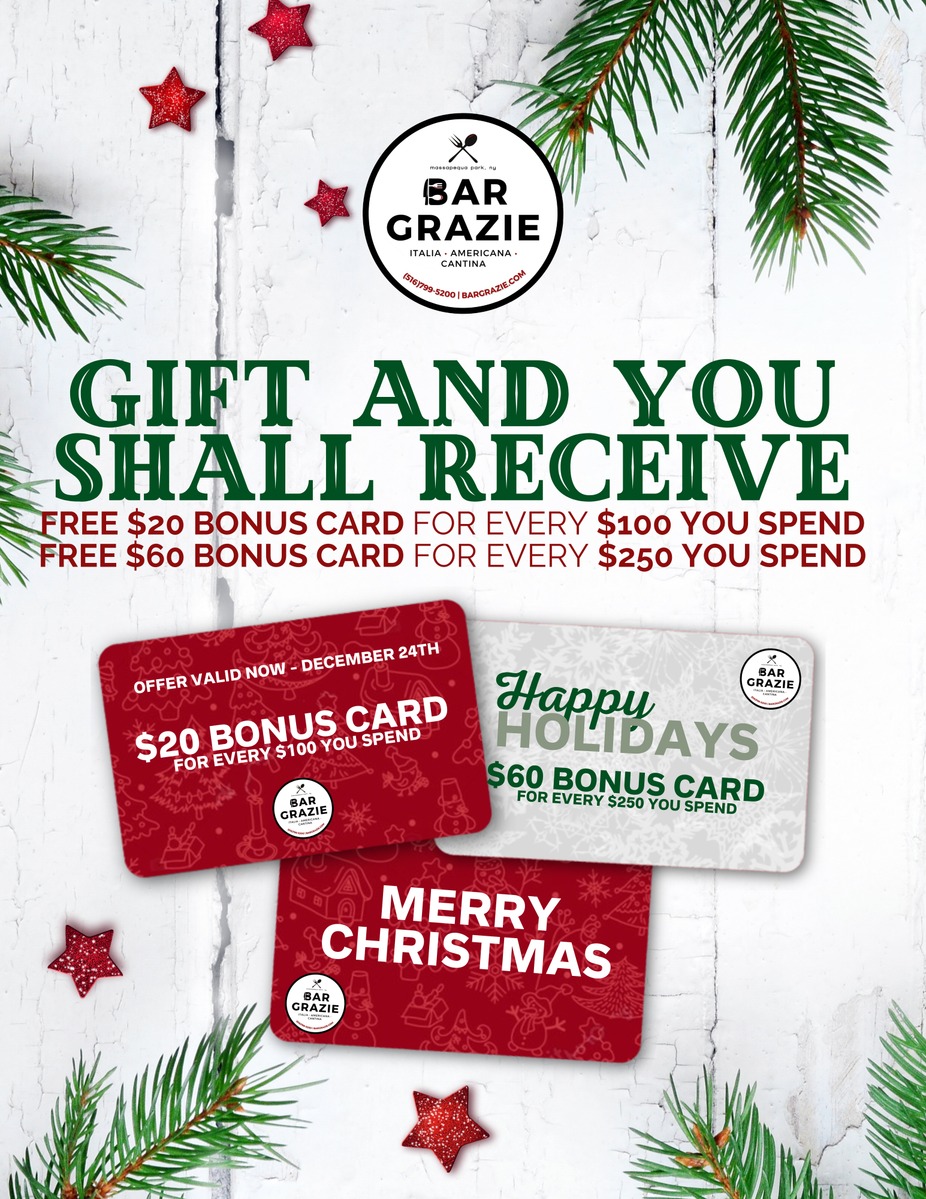 ๐ Holiday Gift Card Event! โข $20 Bonus Card for every $100 โข $60 Bonus Card for every $250 โจ Gift cards must be purchased at Bar Grazie. Offer not valid online. Buy for themโฆ get a little something for you!