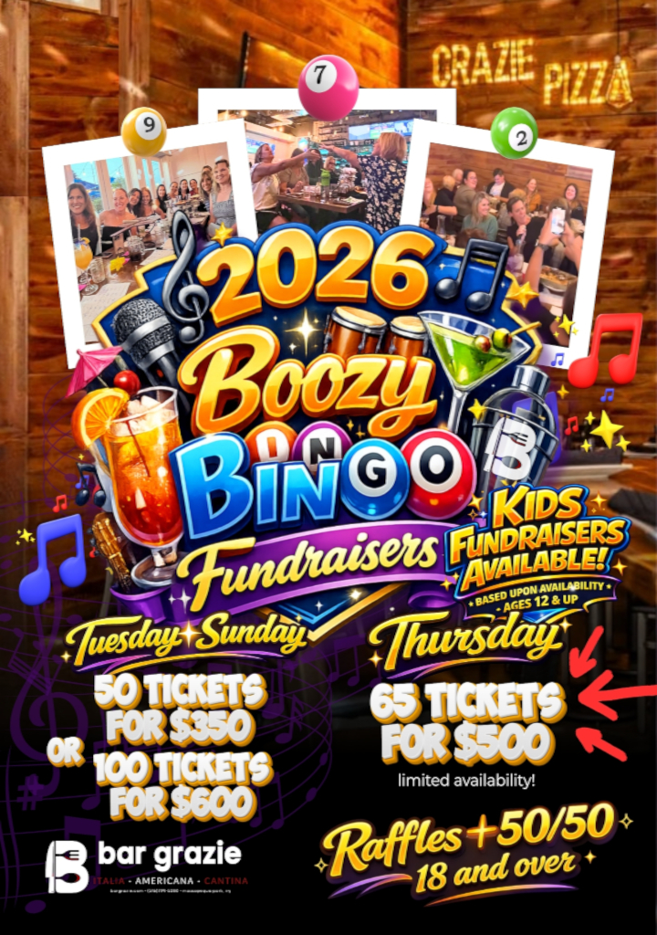 Full Support: We’ll help you plan, execute, and customize your event to ensure maximum success and enjoyment. Our team is here to handle the logistics, so you can focus on having fun and making an impact. Whether it’s for a local charity, school group, or sports team, a Music Bingo Fundraiser at Bar Grazie is sure to hit all the right notes.